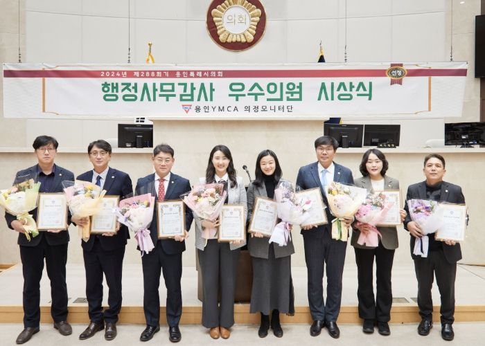 한방통신사 신유철기자 기자 | 용인특례시의회 이창식(신봉동,동천동,성복동/국민의힘), 신나연(구갈동,상갈동/더불어민주당), 임현수(신갈동,영덕1동,영덕2동,기흥동,서농동/더불어민주당), 기주옥(비례대표/국민의힘), 이진규(중앙동,이동읍,남사읍/국민의힘), 박은선(보정동,죽전1동,죽전3동,상현2동/국민의힘), 김병민(구성동,마북동,동백1동,동백2동/더불어민주당), 이교우(신봉동,동천동,성복동/더불어민주당) 의원이 용인YMCA 2024년도 행정사무감사 우수의원으로 선정됐다.
