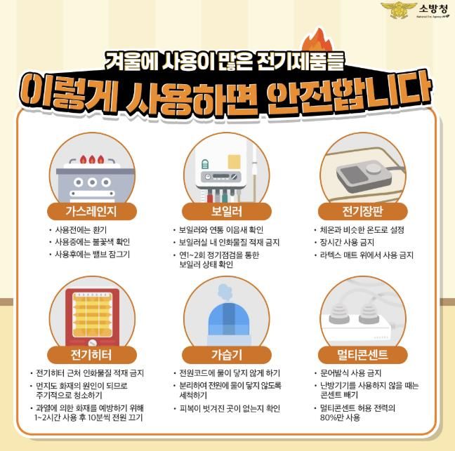이에 소방서는 ▲KC인증마크 제품 사용 ▲전기히터 주변 인화성 물질 제거 ▲외출 시 전원과 플러그 제거 ▲전기 장판 사용 전 전선 파열 여부 확인 ▲필요 이상 장시간 사용 자제 등의 안전한 사용을 당부했다.