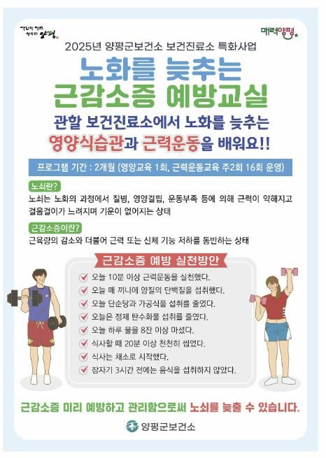 2025년도 양평군은 보건진료소 1개소를 추가 확충할 계획이며, 노쇠를 주제로 한 '근감소증 예방교실' 신규 프로그램도 운영 예정이다. 근감소증은 최근 노년 건강의 주요 관심사로 떠올라 조기예방의 중요성이 강조되고 있으며 양평군은 신규 프로그램을 통해 신체능력 향상, 낙상 위험 감소 등 실질적인 효과를 기대하고 있다.