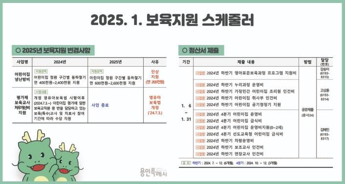 한방통신사 신유철기자 기자 | 용인특례시 수지구는 보육 현장의 행정업무 부담을 줄이고 각종 사업들을 일정에 맞게 신청·정산할 수 있도록 보육현장에 2025년 1월 ‘보육지원 스케줄러’를 제작·배포했다고 10일 밝혔다.