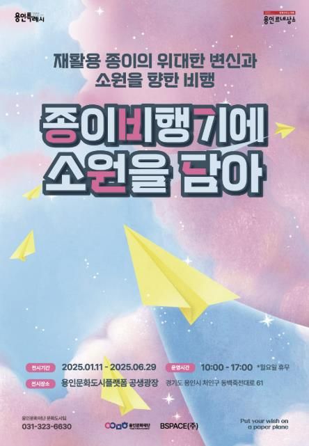 한방통신사 신유철기자 기자 | 용인문화재단은 1월 11일부터 6월 29일까지 ESG 경영의 일환으로 자원순환 참여형 전시 ‘종이비행기에 소원을 담아’ 를 용인문화도시플랫폼 공생광장에서 개최한다.