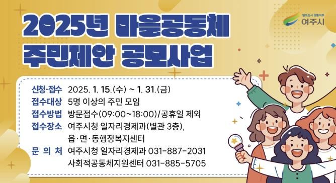 공모사업 신청접수 기간은 1월 15일부터 1월 31일까지이며, 읍·면·동 행정복지센터, 여주시청 일자리경제과에서 접수한다. 자세한 내용 및 필요서식은 여주시청 홈페이지 공고게시판에서 확인할 수 있다.