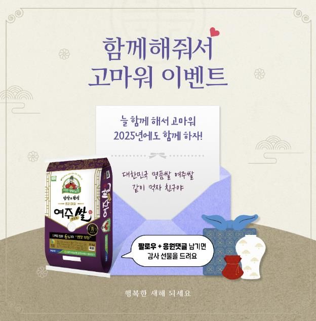 한방통신사 신유철기자 기자 | 여주시 농산업 공동브랜드 활성화센터에서 운영중인 여주대왕님표 공식 인스타그램에서 2025.1월8일~1월19일까지 ‘함께해줘서 고마워 댓글 이벤트’를 진행 한다.