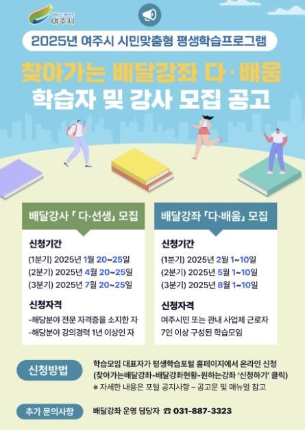 '다·선생' 모집기간은 1월/4월/7월 중 20일부터 25일까지고, '다·배움' 학습자 모집기간은 2월/5월/8월 중 1일부터 10일까지다. 배달강좌를 희망하는 학습자는 여주시평생학습포털 홈페이지 ‘배달강좌 현황’에서 원하는 강좌와 강사를 선택하여 온라인으로 신청할 수 있다.