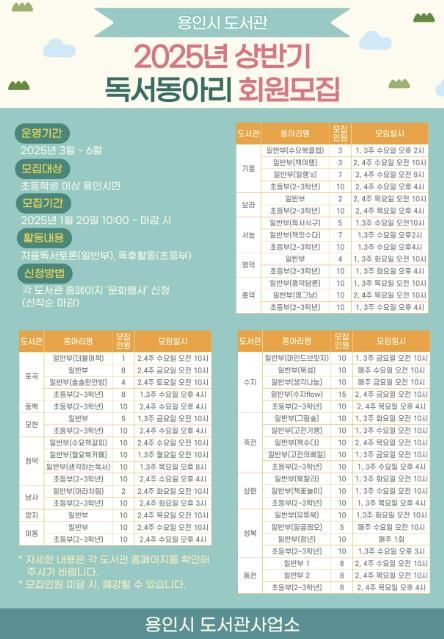 한방통신사 신유철기자 기자 | 용인특례시는 20일부터 17곳의 지역 공공도서관에서 독서동아리 활동에 참여할 회원 423명을 선착순 모집한다고 14일 밝혔다.