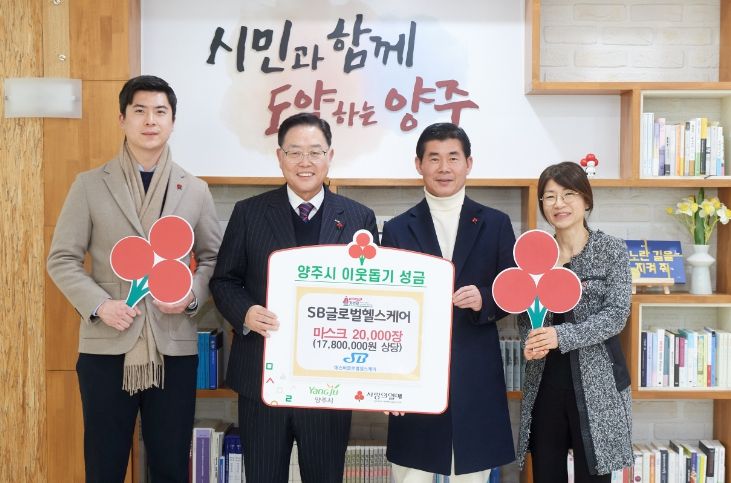 강수현 양주시장은 “어려운 이웃을 위해 큰 나눔을 실천해주신 ㈜에스비글로벌헬스케어의 따뜻한 마음에 깊이 감사드리며, 기부된 마스크는 필요한 곳에 신속히 전달해 지역사회 건강 증진에 기여하겠다”고 밝혔다.