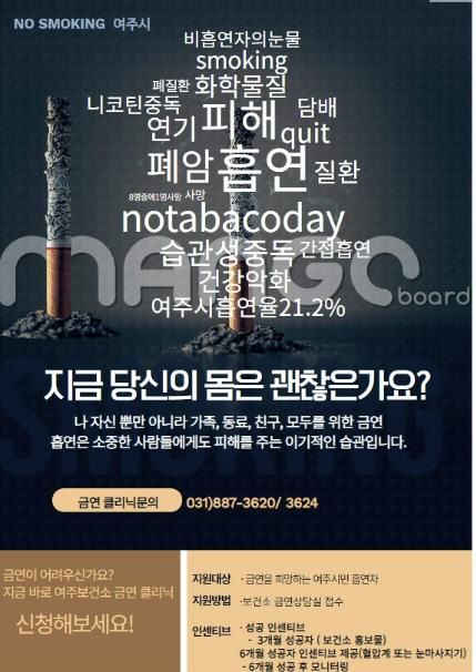 여주시 보건소 건강증진과는 금연클리닉을 통해 지역사회 흡연자의 금연을 지원하고 비흡연자의 간접흡연 폐해 예방을 위한 노력도 기울일 것이라며 적극적인 참여를 독려했다.
