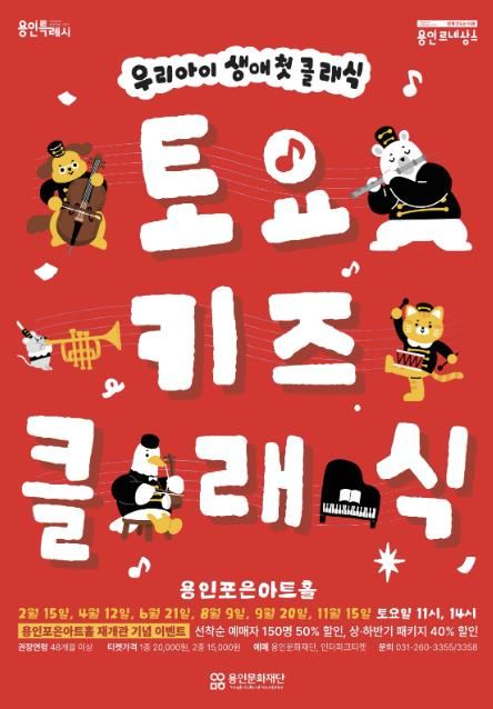오는 18일 용인포은아트홀은 1,525석으로 객석 수를 확장하고 공간을 증축하는 공사를 마치고 재개관을 앞두고 있다. 이에 재단에서는 재개관을 기념하여 ‘토요키즈클래식’을 할인가로 만나볼 수 있는 파격적인 이벤트를 진행하고 있다. 선착순 예매자 150명 대상 50% 할인 판매는 전석 매진됐으나, 상반기 3개 회차(▲2월 15일 ▲4월 12일 ▲6월 21일) 공연을 40% 할인가로 구매할 수 있는 패키지는 예매가 가능하다.
