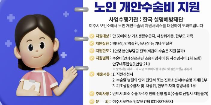 한방통신사 신유철기자 기자 | 여주시보건소 건강증진과에서는 2025년 노인 안(眼) 의료비 지원을 위해 한국실명예방재단과 함께 백내장 등 시력상실이 우려되는 취약계층 노인들의 개안수술비를 지원하고 있다.