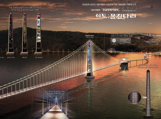 당선작은 ‘이도(세종), 물길다리’를 주제로 한글 창제 공표 전 세종대왕이 신갈천에 머물렀다는 세종실록 기록을 바탕으로 국내 유일의 ‘한글 창제 기념비’를 가운데 세우고 일부 구간은 다리를 지탱하는 긴 케이블을 사용하는 ‘현수교’ 방식을 적용, 일부 구간은 S자형 접속교를 적용한 복합교 형태로 설계됐다.