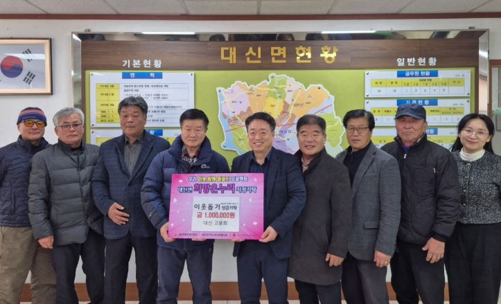 이상윤 대신면장은 “고향에 대한 깊은 사랑과 따뜻한 마음을 모아 성금을 기탁해 주신 대신 고우회에 진심으로 감사드리고, 기탁된 성금은 대신 고우회의 따뜻한 마음이 더욱 널리 퍼질 수 있도록 의미있는 곳에 소중히 사용하겠다.”고 답했다.