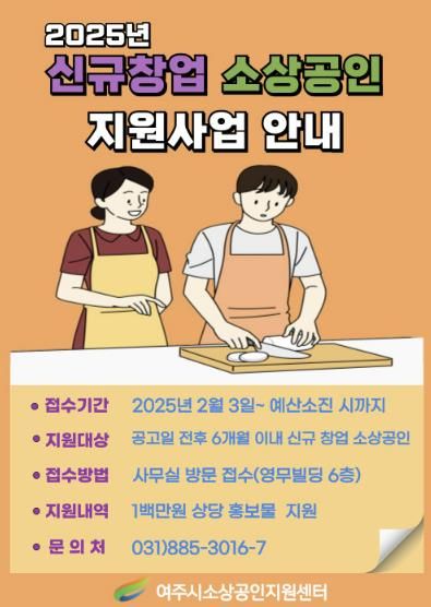 사업 신청은 2025년 2월 3일부터 예산소진 시까지다. 여주시소상공인지원센터 홈페이지에서 사업 내용(공고문)을 확인하고 센터(여주시 세종로 10, 여주시청 별관 6층)로 “방문접수” 하면 된다.