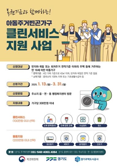 대상자로 선정되면 가구당 300만원 내에서 클린서비스(소독·방역, 장판 교체, 수납 정리, 청소)와 물품(냉난방기·세탁기·공기청정기·건조기)을 경기도 주거복지센터에서 지원할 예정이다. 용인특례시의 경우 지난해와 마찬가지로 올해 14가구가 지원받는다.