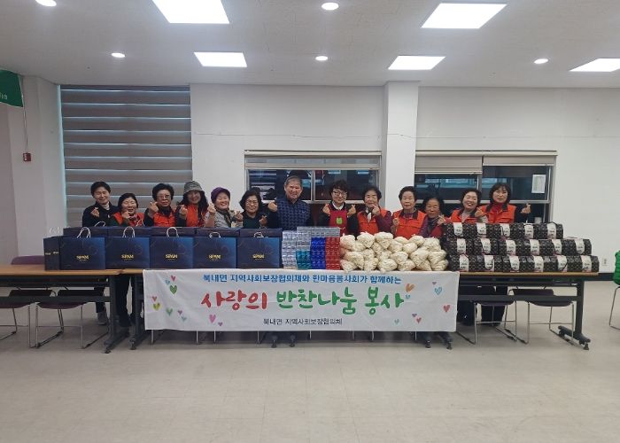 북내면 한마음봉사회는 10년간 북내면 저소득 어르신에게 반찬 서비스, 김장 나눔 행사를 실천하고 있으며, 소외된 이웃 없이 더불어 행복한 북내면을 만들어나가는 데 앞장서고 있다.