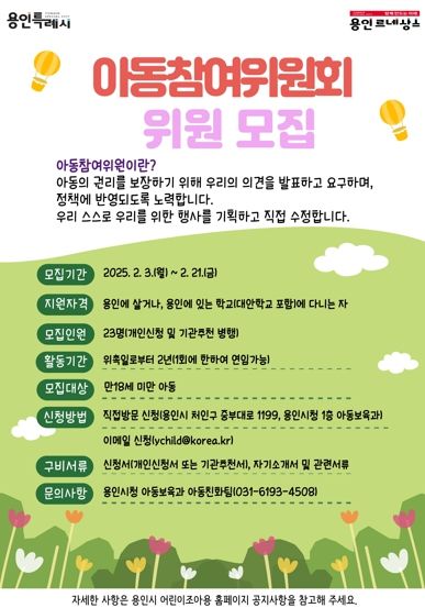 한방통신사 신유철기자 기자 | 용인특례시는 이달 1일부터 21일까지 아동 정책 수립 과정에 직접 참여할 ‘제7기 아동참여위원회’ 위원 23명을 모집한다고 2일 밝혔다.