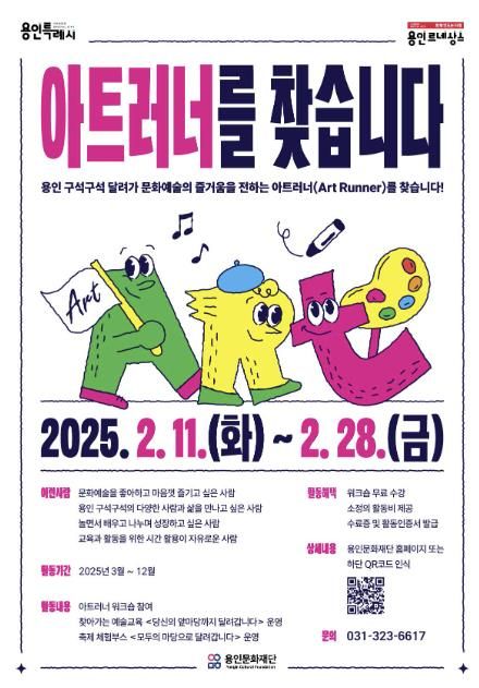 문화예술을 좋아하고 예술의 가치를 전하고 싶은 용인시민이라면 누구나 지원 가능한 이번 ‘아트러너’ 모집은 오는 2월 11일부터 28일까지 용인문화재단 홈페이지 공지사항을 통해 신청할 수 있다.
