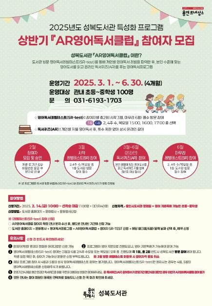 AR영어독서클럽은 초·중학생들을 대상으로 영어 원서 읽기를 돕는 성복도서관의 특성화(다국어) 프로그램으로 매년 상·하반기로 나눠 진행한다. 상반기 과정은 3월부터 6월까지, 하반기 과정은 8월부터 11월까지다.