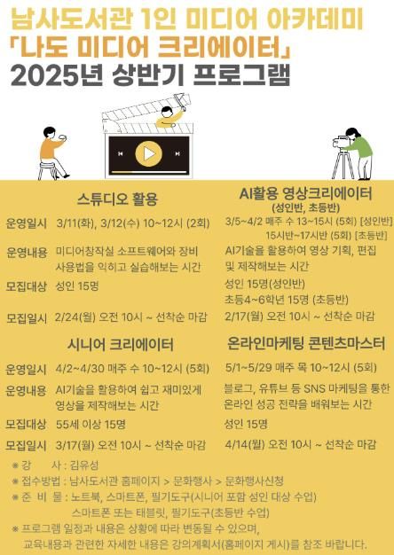 교육 신청은 남사도서관 홈페이지 문화행사신청 게시판에서 ▲AI활용영상크리에이터 교육은 17일 ▲스튜디오 활용 교육은 24일 ▲시니어 크리에이터 교육은 3월 17일 ▲온라인마케팅 콘텐츠마스터 교육은 4월 14일부터 할 수 있다.