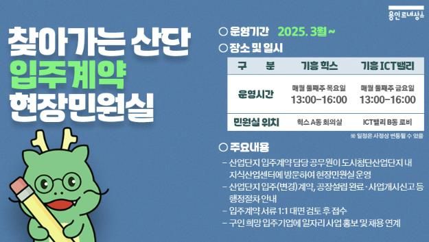 한방통신사 신유철기자 기자 | 용인특례시는 3월부터 지역내 도시첨단산업단지 지식산업센터 입주기업을 대상으로 ‘찾아가는 산단 입주계약 현장민원실’을 운영한다고 18일 밝혔다.