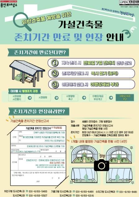 시는 가설건축물의 존치기간 연장신고서 접수시 해당 가설건축물의 현황을 확인할 수 있는 사진을 함께 제출하도록 건축법 시행규칙이 개정됨에 따라 안내문을 제작했다.