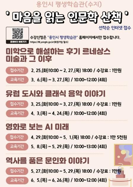 한방통신사 신유철기자 기자 | 용인특례시는 25일부터 ‘2025년 마음을 읽는 인문학 산책’ 수강생을 모집한다고 19일 밝혔다.