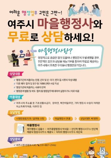 민원토지과 관계자는 “마을행정사 운영을 통해 행정사 수임이 어려운 취약계층에게 도움이 될 것이라 기대하고 이번 서비스를 통해 여주시는 항상 시민들의 곁에서 시민들을 위한 행정을 위해 노력하고 있으며, 마을행정사 운영을 통해 어려운 취약계층에게 도움이 될것이라 기대하고 행정 사각지대 최소화에 만전을 기하겠다”라고 말했다