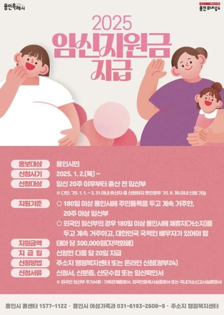 지원 대상은 신청일 기준 180일 이상 용인시에 주민등록을 두고 살고 있는 20주 이상의 임신부다. 외국인 임신부의 경우 180일 이상 용인시에 체류지(거소지)를 두고 배우자가 대한민국 국적일 경우 신청할 수 있다.