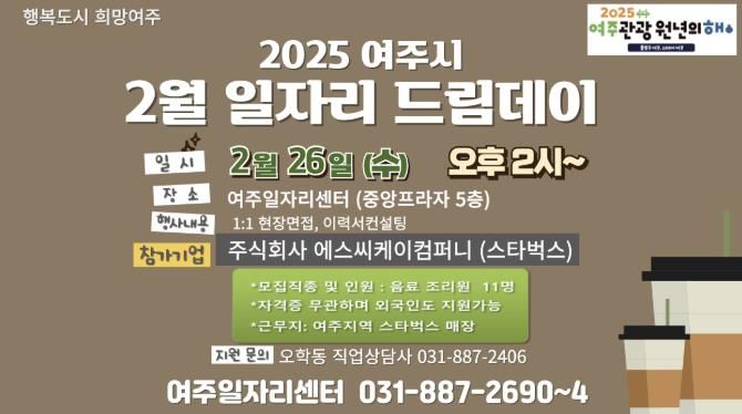 한방통신사 신유철기자 기자 | 여주시는 오는 2월 26일 오후 2시 여주일자리센터(세종로 14번길 18, 중앙프라자 5층)에서 2025년 두 번째 일자리드림데이를 개최한다.