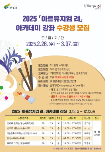 한방통신사 신유철기자 기자 | 여주시 미술관 '아트뮤지엄 려'는 2025년 아트뮤지엄 려 아카데미 프로그램을 운영하고자 수강생을 모집한다. 이번에 진행되는 성인강좌 프로그램은 5개 강좌(유화, 수채화, 사진, 소묘, 현대민화)이며 상·하반기 15주씩, 총 30주 과정으로 운영한다.