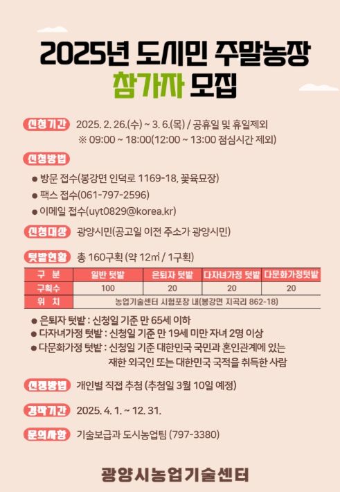 하진옥 광양시 기술보급과 도시농업팀장은 “주말농장을 통해 시민들이 가족과 함께 농작물을 키우는 기쁨을 느끼고, 직접 재배한 농산물로 건강한 식탁을 만들 수 있길 바란다”며 “이를 계기로 농업과 농촌에 대한 관심이 더욱 높아지길 기대한다”고 말했다.