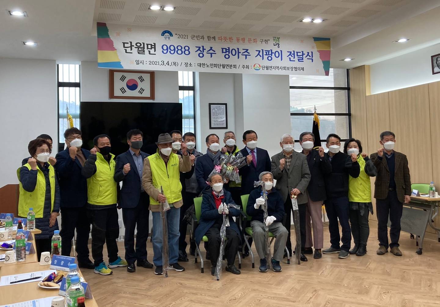 양평군 단월면지역사회보장협의체(위원장 정인희)에서는 지난 4일 대한노인회단월면분회 사무실에서 정동균 양평군수를 비롯한 단월면기관단체장 등 20여 명이 참석한 가운데 지역 어르신들의 무병장수를 기원하며 “9988 장수 명아주 지팡이(단월 청려장) 전달식”을 가졌다.