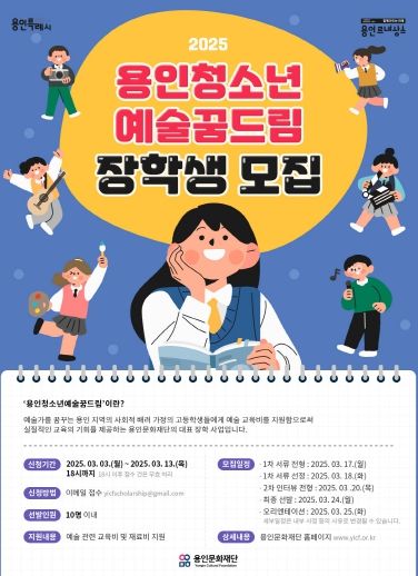2025년 ‘용인청소년예술꿈드림’ 장학 사업은 용인시 소재 고등학교에 재학 중이고 예술 분야에 진학을 목표로 하는 청소년들을 대상으로 하며 선정된 장학생들에게는 장학금을 통해 관련 학과 진학에 필요한 교육비 등 실질적인 지원을 할 예정이다.