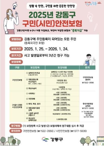 이수희 강동구청장은 “예기치 못한 재난이나 사고로 피해를 입은 구민들에게 구민안전보험이 생활 속 든든한 안전망이 되길 바라며, 구민의 생활 안정에 실질적인 도움이 될 수 있도록 더욱 노력하겠다”라고 전했다.