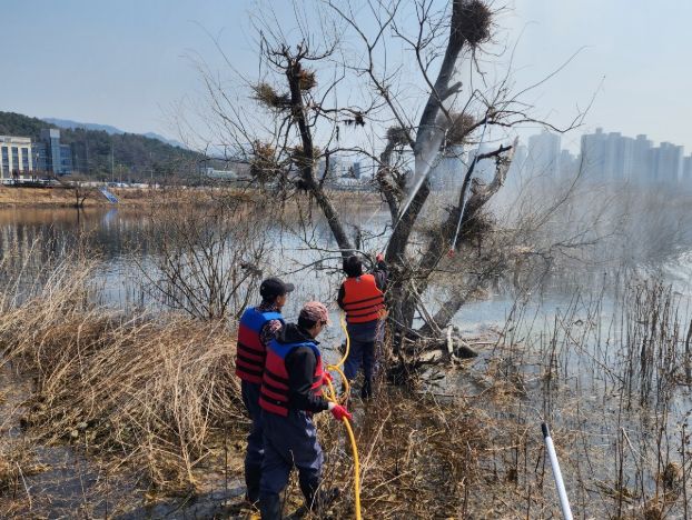 춘천시에 따르면 3월 20일 오전 춘천시 환경정책팀과 야생생물관리협회 춘천 2지회는 소양강 하류 버드나무 군락지에서 민물가마우지 묵은 둥지를 제거했다.