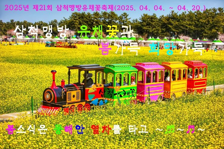 한편, 삼척맹방유채꽃축제는 2002년부터 지속된 축제로 매년 30여만 명이 다녀가는 삼척의 대표 축제이다. 6ha에 펼쳐진 유채꽃밭은 푸른 바다, 벚꽃길과 어우러져 삼척에서만 경험할 수 있는 특별한 풍경으로, 봄맞이 관광객들에게 소중한 추억과 낭만을 선사할 것으로 기대된다.