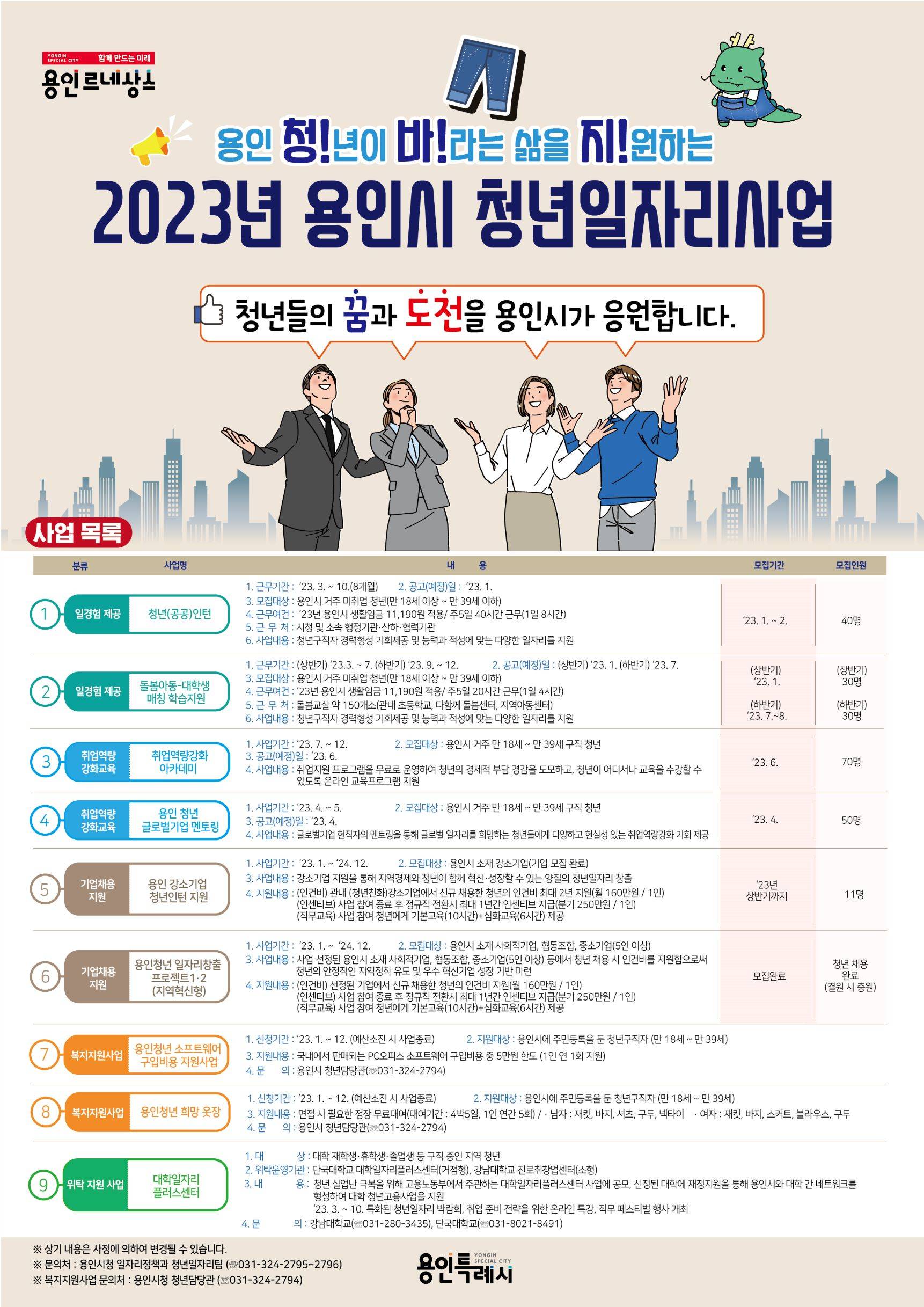 탄탄한 경쟁력을 갖춘 우수 강소기업들이 청년들을 채용할 때 인건비 일부를 지원하는 '강소기업 청년인턴 지원', 사회적기업 및 협동조합에서 청년을 채용할 경우 인건비 일부를 지원하는 '용인청년일자리 창출프로젝트1', 중견ㆍ중소기업에서 청년을 채용할 수 있도록 인건비 일부를 지원하는 '용인청년일자리 창출프로젝트2' 등이다.