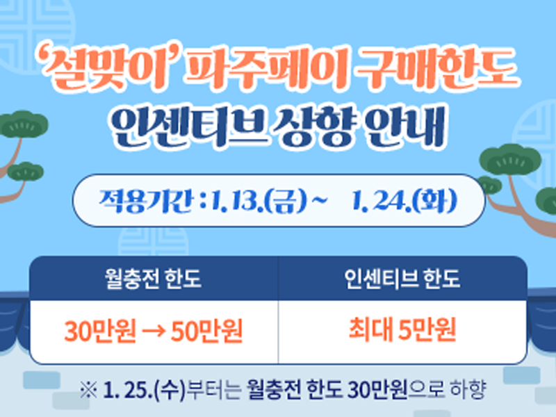 파주시(시장 김경일)는 설 명절을 맞아 1월 13일부터 24일까지 지역화폐인 ‘파주페이’의 인센티브 지급한도를 30만원(3만원)에서 50만원(5만원)으로 상향했다.