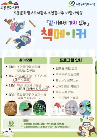 한방통신사 신유철기자 기자 | 도봉구 도봉문화정보도서관이 초안꿈마루 어린이식당과 협업해 책과 연계한 메이커스페이스 프로그램 ‘책메이커’를 운영한다고 밝혔다.