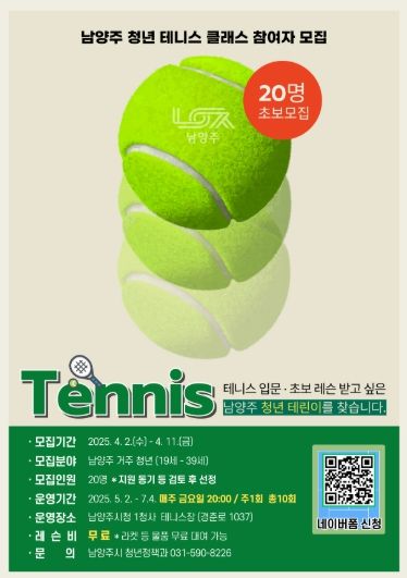 한방통신사 신유철기자 기자 | 남양주시는 오는 2일부터 10일까지, 청년들의 건강한 신체 활동을 지원하기 위한 ‘청년 테니스 클래스’ 참가자를 모집한다고 1일 밝혔다.