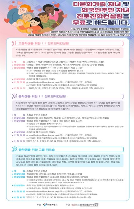 이에 따라 매년 공모를 통해 진로·진학 분야에서 전문성을 갖춘 기관을 선정하여 다문화가족 자녀에게 진로 탐색 기회를 제공하고 있다. 변화하는 입시제도와 다양한 전형을 분석해 학생뿐 아니라 학부모 대상으로도 진학설명회와 개별 맞춤형 컨설팅을 제공하여, 개별 입시전략 수립과 단계별 준비를 체계적으로 지원한다.