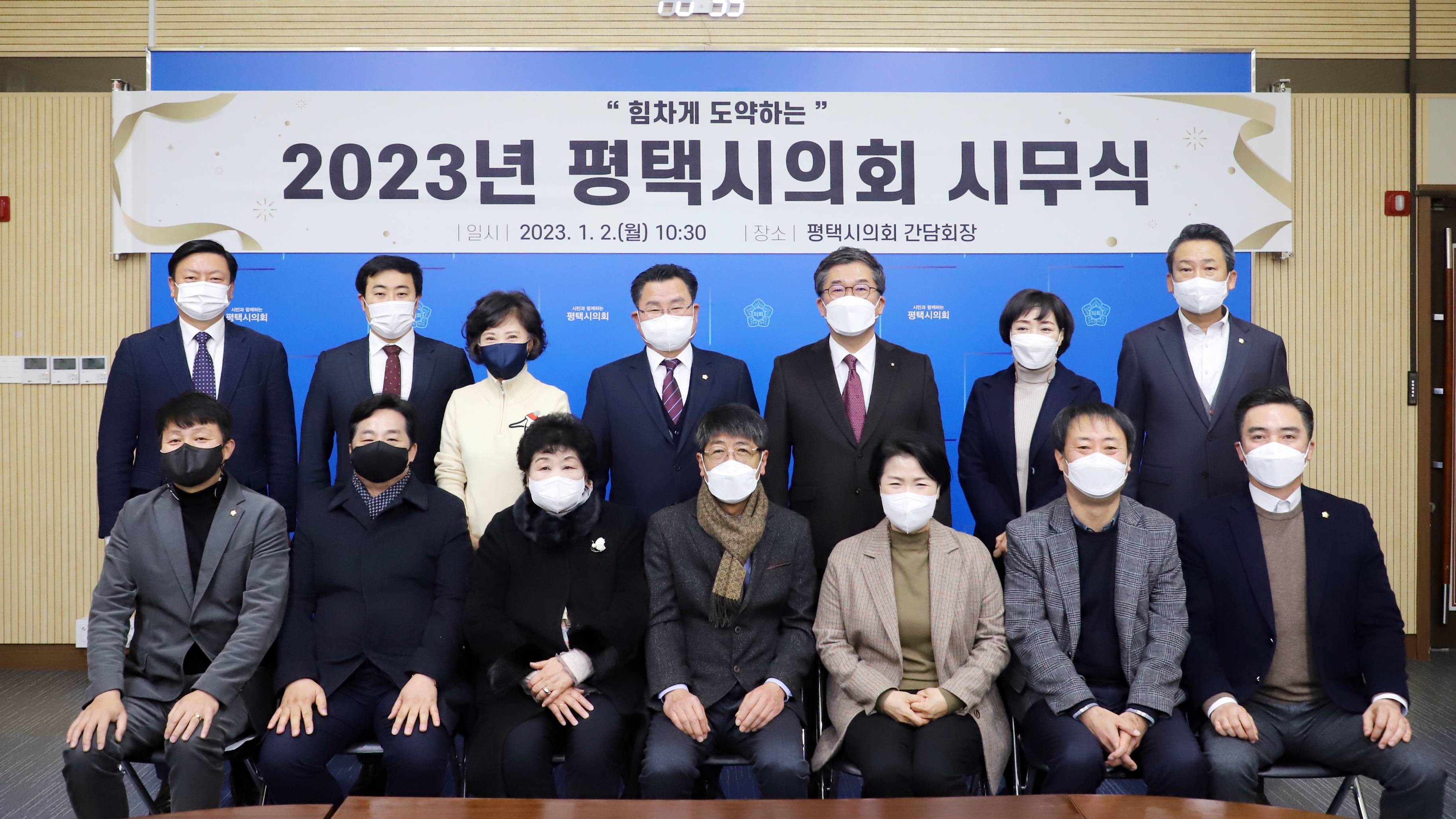 평택시의회(의장 유승영)는 2일 시의회 간담회장에서 의원 및 의회사무국 직원 등 50여 명이 참석한 가운데 2023년 시무식을 가졌다.