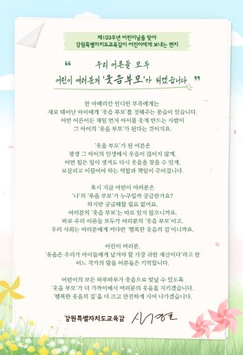 한방통신사 신유철기자 기자 | 강원특별자치도교육청은 제103주년 어린이날을 맞아 도내 어린이에게 희망과 응원의 메시지를 담은 교육감 서한문을 발표했다.