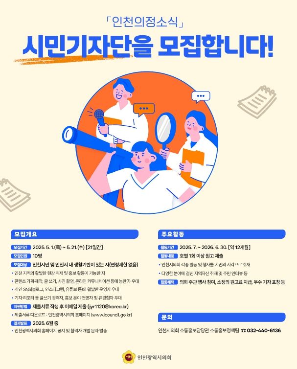 6일 인천시의회에 따르면 지난 1일부터 오는 21일까지 인천시민 및 인천지역 내 사업장·회사·학교 등 생활 기반을 두고, 활발한 현장 취재 및 홍보 활동이 가능한 ‘인천의정소식’ 시민기자단을 모집한다.