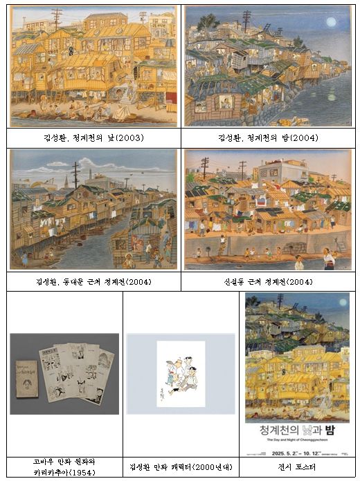 전시는 그림의 배경이 된 6·25전쟁 이후 청계천 판자촌의 형성 과정과 이후의 변화를 소개하고, 김성환이 그린 청계천 풍속화를 통해 청계천 모습과 사람들의 삶을 재조명한다.