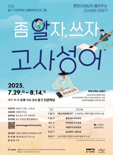 한방통신사 김성의 기자 | 광주 동구는 오는 25일까지 동구 인문학당 여름방학 프로그램인 ‘좀 알자, 쓰자 고사성어’에 참여할 초등학생을 모집한다고 밝혔다.