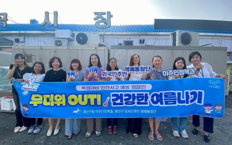 이날 캠페인은 광산구 외국인주민 명예 통장단이 함께 참여해 출신 국가별 외국인 노동자에게 온열질환 예방법을 각국의 언어로 전달했다.