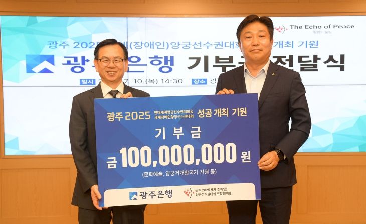 이번 전달식에서 광주은행은 ‘광주 2025 현대세계양궁선수권대회’ 및 ‘광주 2025 세계장애인양궁선수권대회’의 성공적인 개최를 지원하기 위해 조직위원회에 1억 원의 기부금을 전달했다.