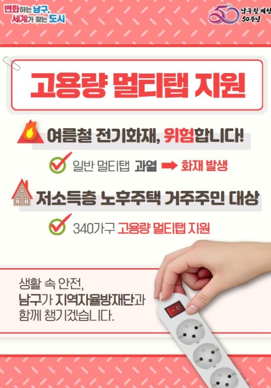 한방통신사 신유철기자 기자 | 부산 남구는 여름철 전기 과부하로 인한 화재 사고를 예방하기 위해 관내 노후주택(아파트 포함)에 거주하는 안전 취약 계층 340가구에 고용량 멀티탭을 지원한다.