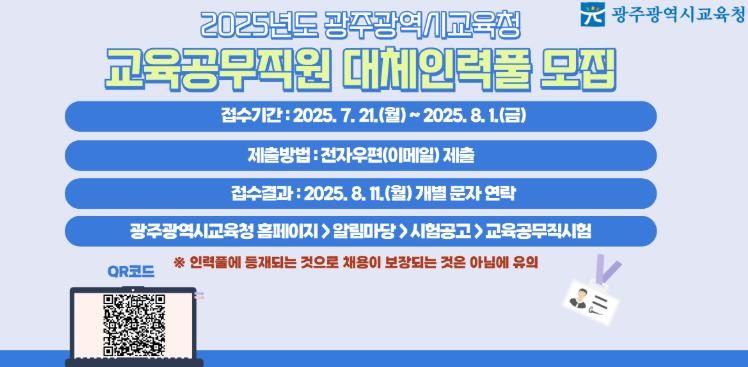 한방통신사 김성의 기자 | 광주시교육청은 교육공무직원의 휴가·휴직 등으로 인한 인력 공백을 채우기 위해 ‘교육공무직원 대체인력풀’을 공개 모집한다.