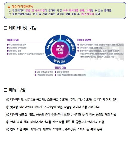 데이터마켓 참여와 활성화를 위해 지난 5월에는 민간 기업과 공사·공단 등 유관기관이 참여한 ‘부산 민관 데이터 공유·활용 협의체’를 구성해 기업 거래 데이터 등록을 유도하고, 협업 방안을 논의했다.